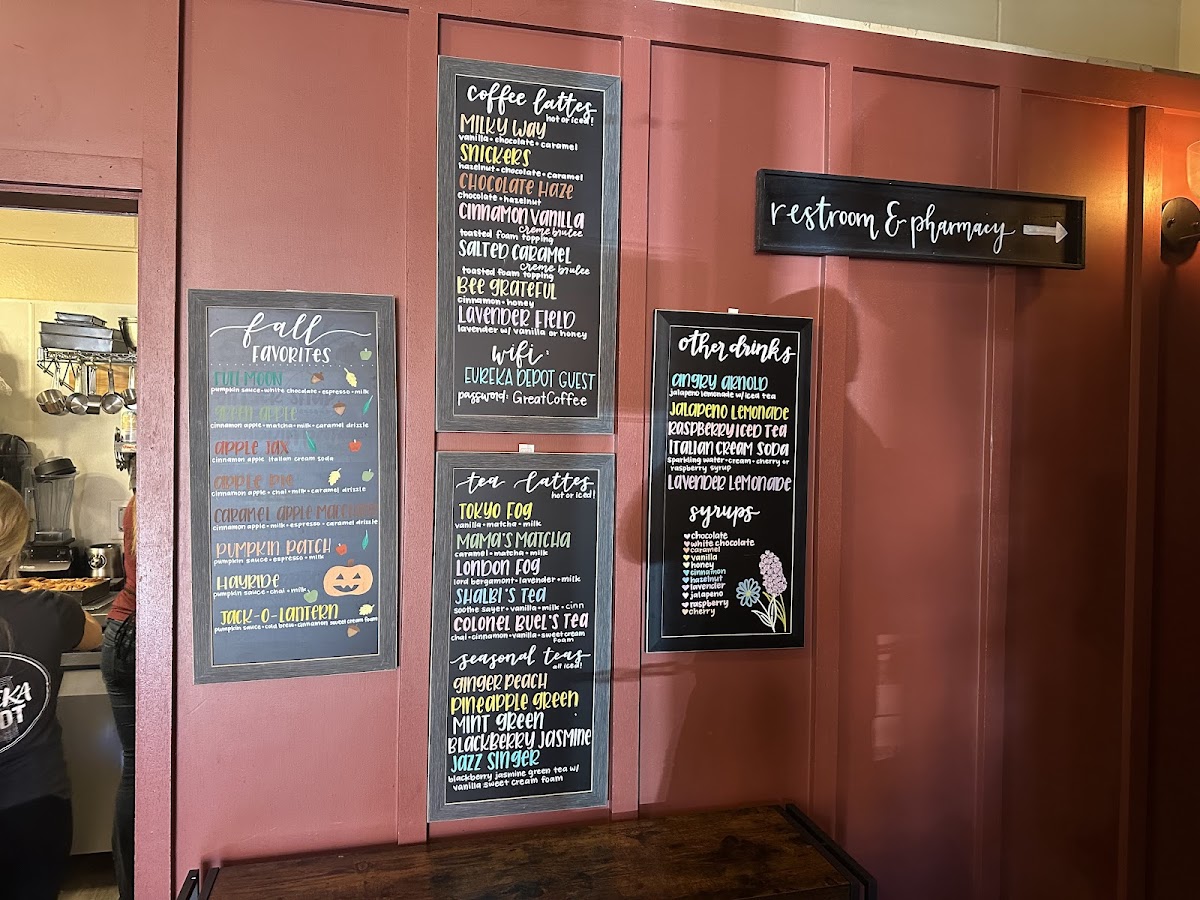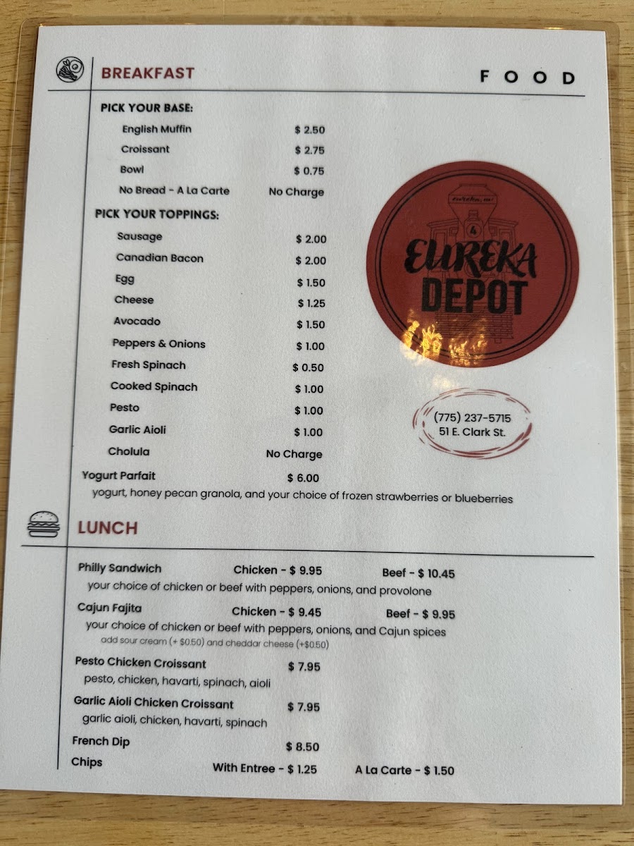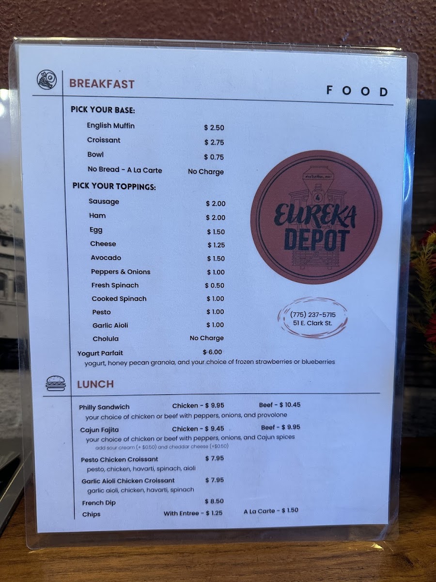 From a reviewer’s perspective, the menu at Eureka Depot offers a cozy mix of coffeehouse classics and satisfying lunch options, with a clear emphasis on specialty drinks and quick bites. The drink selection is broad, featuring syrups like Chocolate, White Chocolate, Caramel, Vanilla, and Honey, along with seasonal creations such as The Buzz, Vietnamese Cold Brew, Cinna-Bun Spring Charisma, and Desert Daze, which add a creative twist to the menu. For lunch, options like the Philly Sandwich, Pesto Chicken Croissant, Garlic Aioli Chicken Croissant, French Dip, and Chips provide hearty choices that pair well with their coffee offerings. Non-coffee drinkers can enjoy Hot Chocolate, Smith's Tea, Black Iced Tea, Chai Tea Latte, and Matcha Latte, while classic coffee lovers can stick with Espresso, Americano, Cappuccino, Latte, or Caramel Latte. The espresso drink lineup also includes Breve alongside the usual favorites, and seasonal treats like the Pumpkin Latte and Pumpkin Patch add variety. Lighter options such as the Yogurt Parfait round out the menu, making Eureka Depot a well-balanced stop for both drinks and casual meals.