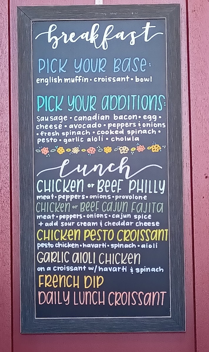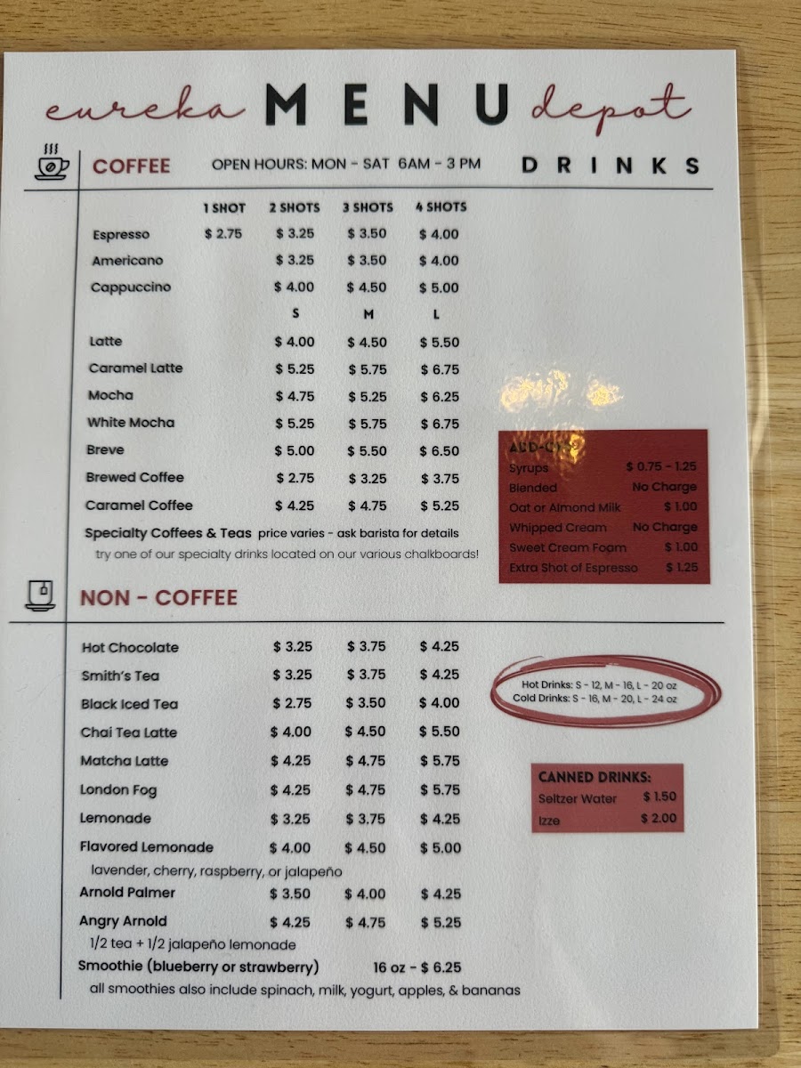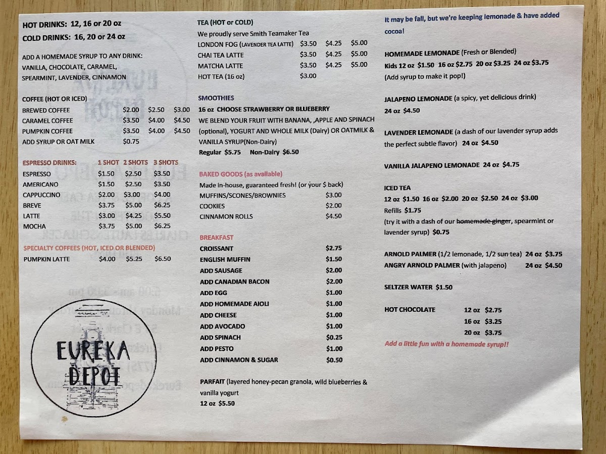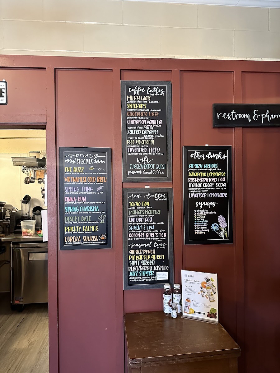 From a reviewer’s perspective, the menu at Eureka Depot offers a cozy mix of coffeehouse classics and satisfying lunch options, with a clear emphasis on specialty drinks and quick bites. The drink selection is broad, featuring syrups like Chocolate, White Chocolate, Caramel, Vanilla, and Honey, along with seasonal creations such as The Buzz, Vietnamese Cold Brew, Cinna-Bun Spring Charisma, and Desert Daze, which add a creative twist to the menu. For lunch, options like the Philly Sandwich, Pesto Chicken Croissant, Garlic Aioli Chicken Croissant, French Dip, and Chips provide hearty choices that pair well with their coffee offerings. Non-coffee drinkers can enjoy Hot Chocolate, Smith's Tea, Black Iced Tea, Chai Tea Latte, and Matcha Latte, while classic coffee lovers can stick with Espresso, Americano, Cappuccino, Latte, or Caramel Latte. The espresso drink lineup also includes Breve alongside the usual favorites, and seasonal treats like the Pumpkin Latte and Pumpkin Patch add variety. Lighter options such as the Yogurt Parfait round out the menu, making Eureka Depot a well-balanced stop for both drinks and casual meals.